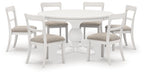 | Details | PCD824D10: Includes dining table top and base, Top made with hardwood solids, mango wood veneer and MDF substrate, Cast resin pedestal base, Antiqued white finish, Assembly required, PCD824-02: Made with sturdy solid wood frame, Antiqued white finish, Polyester upholstery, Foam cushioned seat, Includes adjustable levelers, Assembly required, | |