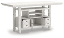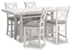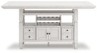 | Details | D642D7: Includes dining table top and base, Made with rubberwood solids, ash veneer and MDF substrates, Antiqued white finish with wood grain texture, Two 10-bottle wine storage shelves (1 reversible), Lower door cabinet accessible from both sides, 2 pass-through drawer bins, Assembly required, D642-124: Made with wood, Antiqued white finish with wood grain texture, Foam cushion with polyester upholstery, Nailhead trim, X-back, Assembly required, | |