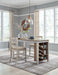 This counter height dining room table set invites you to raise the bar on small space living. An inspired choice for coastal chic or modern farmhouse settings, this clean-lined, simply striking table doubles the charm with a brown tone top with plank effect, paired with a grayish white base with rub through effect for timeworn appeal. Built-in 8-bottle wine rack and pair of open shelves make the most of every inch of space. Two bar stools with classic ladderback styling and comfortably upholstered seats make room for one and all