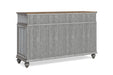 Entertain in relaxed cottage style with everything you need to host dinner guests with this Plymouth buffet. A weathered graywash finish is accented by a medium brown top and gunmetal pulls, while paneled details and turned bun feet add to the cozy vintage character. This buffet features two cabinet spaces with adjustable shelves and a removable wine rack that can store up to 16 bottles. Pair that with six spacious drawers—complete with felt-lined top drawers and a removable silverware tray—and you have ample storage for serving pieces and other dining essentials. Each drawer features ball-bearing glides for smooth access and support for heavy dining ware.