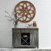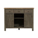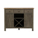 Invite a classic look with a casual feel into your home with the Lindsey Farm server. Crafted of rubberwood solids and veneers with MDF, this piece features a gray and sandstone finish, inverted v design on both doors, levelers to protect your flooring and adjust the height, three drawers accented with gray wood knob hardware, one adjustable shelf behind each door, and removeable x shaped wine shelving. This piece has an alternate finish and offers a look that compliments today's homes with style uncompromised.