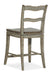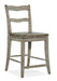 The La Riva Memory Swivel Counter Stool has a classic ladderback design with a French twist, distinguished by a soft silhouette and stylish flair. Crafted of Oak Veneers, the La Riva Counter Stool has a 24 ¼-inch seat height and is finished in an organic Oyster color in a versatile neutral light gray tone with distressing and scaping for the look of an authentic antique.