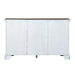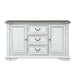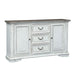 It’s never been easier to be elegant with the Abbey Park buffet. Crafted of poplar solids and cathedral white oak veneers, this piece features an antique white finish with heavy chipping and a weathered brown with whitewash top, accented with antique pewter bail pull and knob hardware. This buffet has two doors and three drawers with raised panel drawer fronts and solid framed molding. The top drawer has premium felt lining. The shaped corners flow into chamfered pilasters with a fluted top. Blending of European traditional design influences makes Abbey Park a truly unique style for any living space.