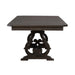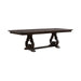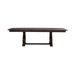 The Grant Park Trestle Table is crafted of Rubberwood solids and Cathedral White Oak veneers in a rich Cappuccino finish. It features a 20-inch self-storing leaf on an Easy Glide track system for effortless expansion. The tabletop is designed with canted corners and bread board veneer ends, while the base showcases two elegant scrolled pedestals with shaped bracket feet connected by a sturdy center trestle.