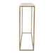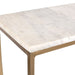 Classic and minimalistic, this narrow console table is supported by brass finished metal legs and complemented by a white marble top with subtle gray veining. Due to the nature of natural stone, every piece will vary slightly ensuring yours is unique.