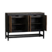 Accent your space with the Harvest Home door server. Crafted of rubberwood solids with knotty white oak veneers, this piece features a chalkboard finish with saw cut hewing, a gorgeous and unique solid wood mosaic front that adds dimension, four doors with two adjustable shelves and two felt lined drawers hidden behind them, bottom slat style shelf for additional storage or display items, thick butcherblock style planked tops with a solid wood edge, and is accented by antique pewter hardware. This server effortlessly creates a casual look with a classic feel.