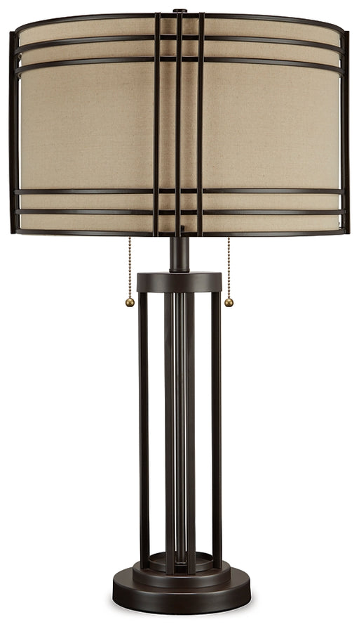 Signature Design by Ashley®Add a touch of rustic industrial style to your decor with this eye-catching table lamp. Its drum shade and decorative metal frame bring an appealin...