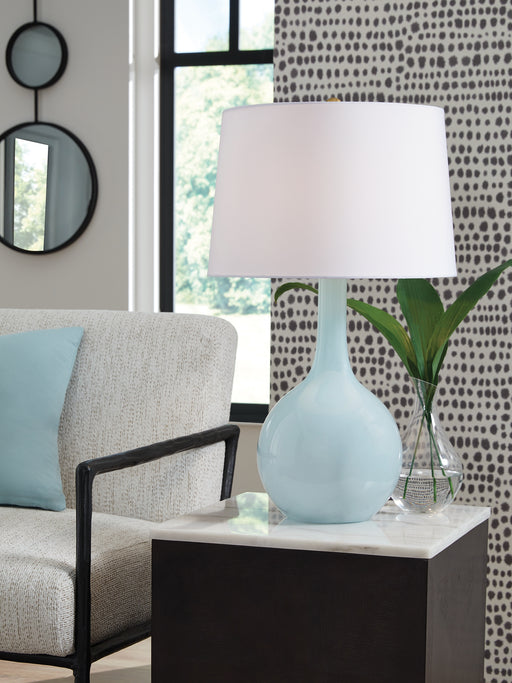 Signature Design by Ashley®More than mere lighting, this spectacular table lamp illuminates your good taste. Its elegant silhouette, crafted from aqua blue glass, is contempo...