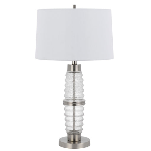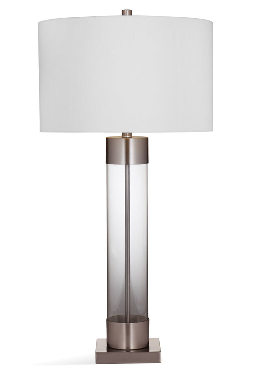 Bassett MirrorThe Tennison Table Lamp is crafted of clear glass and brushed nickel with a white drum shade.Product Features The tall clear lamp body and brushed ...