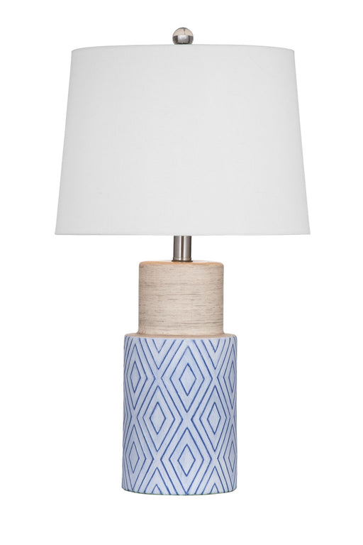 Bassett MirrorThe Shire Table Lamp is crafted of ceramic with a white drum shade.Product Features This blue and gray table lamp features a Coastal style. The dru...