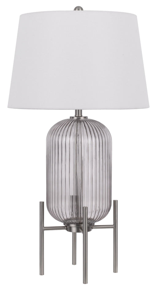 Cal Lighting150W 3 Way Fluted Column Glass Table Lamp With Metal BaseProduct Features Durable Metal and Glass Construction Smoke Glass Body Hardback Linen Shad...