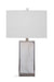 - This modern style lamp features a white and gray marbled body framed in a silver brushed steel frame