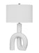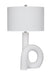 The Alexx Table Lamp features a bold and artistic modern style, with a matte white resin body that curves into an abstract loop, offering a playful yet sophisticated form. Its unique structure acts as a sculptural element, while the uniform matte finish enhances its contemporary appeal. Topped with a white drum shade, the lamp provides a cohesive look that is versatile enough to complement a range of decors, adding a touch of modern artistry to any space.