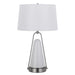 This contemporary table lamp is great piece of decor above a nightstand or side table. It features a study brushed steel frame with a a conical style led night light. This lamp ships complete with a round white fabric shade and matching finial.