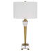 This elegant metal table lamp is a stylish addition to any living room, office or bedside space. It features a slim torch style antique brass metal body body with smooth marble accents. A solid square crystal weighted base completes the look.