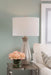- The drum shaped lamp shade is constructed of a white linen fabric