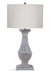 - The gray washed mango wood lamp features detailed molding and blue undertone for a french country aesthetic