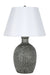 The Dhurrie Table Lamp boasts a distinctive ceramic lamp body with a deeply textured surface that resembles the intricate weave of a Dhurrie rug. Its reactive dark green hue is versatile, offering a rich palette that complements a range of interior designs. The robust, rounded base of the lamp provides a solid foundation for the tapering white lampshade, which casts an inviting light, perfect for creating a warm, ambient setting in any room. This lamp skillfully marries the artisanal texture with the functionality of modern lighting.