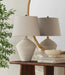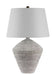The Eclipse Table Lamp features a concrete body with a tactile, textured surface that provides a visual interest reminiscent of natural stone or woven fabric. Its base tapers to a narrower neck before expanding into a wider form, creating an eye-catching geometric silhouette. This lamp is completed with a classic white lampshade, ensuring that the lamp casts a warm, diffused light, ideal for creating a cozy and inviting atmosphere. The neutral color palette and intricate texture make the Eclipse Lamp versatile for both contemporary and more traditional interiors.