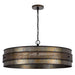 With a distress metal finish, this chandelier is styled to complement various styles from rustic to modern. It features a metal drum shade with a decorative mesh outer band. This eye catching fixture ships complete with matching canopy and chain.