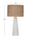 The Laramie Table Lamp captures the essence of coastal style with its resin lamp body, which is sculpted to resemble carved wood, evoking a sense of beachside driftwood. The body's distressed white finish contributes to its laid-back, seaside charm. This casual aesthetic is complemented by a natural, woven lampshade, which adds an organic texture and casts a warm, ambient light reminiscent of a sunlit shore. Perfect for creating a relaxed and inviting atmosphere, this lamp pairs well with light, breezy interior designs.