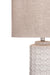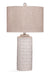 The Marina Table lamp features a textured dimensional pattern on the white cylinder lamp body. It is finished in white and paired with gray linen drum shade for a French Country style.
