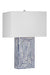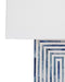 - This blue and white table lamp features a Modern style.