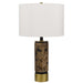 This charming table lamp creates an elegant look for an end table, console, or nightstand. It features a cylinder marble body with antique brass accents. A crisp white linen shade completes the look.