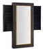 Evoke the rustic grandeur and dramatic vistas of the American wilderness with the Big Sky Floor Mirror. Crafted of Wood and resin, it is finished in Furrowed Bark, a charcoal color with a crosshatch texture with a contrasting trim in Vintage Natural around the mirror. The mirror features left and right pullouts lined with black felt for jewelry storage with three rows of 15 necklace hooks and two rows of ring slots. Attaches to the wall.