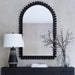 The Renn Wall Mirror features a rectangular shape with an arched top and is studded with whimsical wooden spheres. The mirror frame features a black finish.