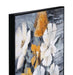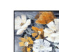 The Celedon canvas wall art presents a striking floral arrangement with blooms in shades of white and touches of yellow, set against a moody, gray-toned backdrop that evokes a modern, yet ethereal feel. This artwork is encased in a bold black frame that not only contrasts the delicacy of the flowers but also anchors the piece firmly within a contemporary design context.