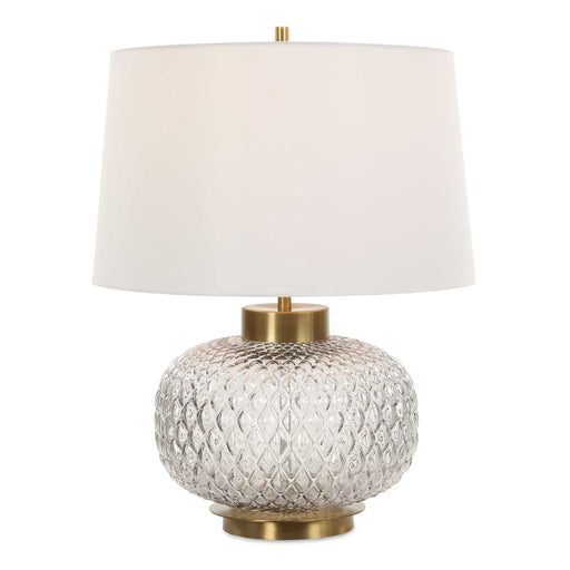 UttermostThe Estelle Table Lamp Features A Heavily Embossed, Round Lattice Inspired, Light Smoke-gray Glass Base Accented By A Chunky Antique Brass Foot And...