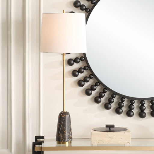 UttermostThe Jenson Buffet Lamp Showcases A Striking Black Marble Base With Contrasting Brown And White Veining, Complimented With A Plated Brushed Brass Ba...