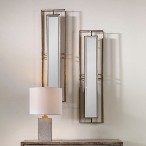 UttermostClean And Contemporary, Each Mirror Exhibit Linear Metal Frames With A Nearly Two Inch Open Depth. Each Frame Is Finished In A Heavily Antiqued Gol...