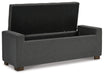 | Details | Polyester upholstery in gray, Wood legs with brown finish, Tufted seat cushion, Hinged seat, Interior storage | |