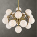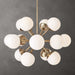 Designed With Mid-Century Roots A Sputnik Center Structure Finished In A Warm Antique Brass And Accented With 5" Matte White Opal Globes Yields A Modern Take On Vintage Style. 16-60 Watt Max G16.5 Candelabra Sockets. Bulbs Not Included. Supplied With 15' Wire, 3-12" Stems And 1-6" Stem For Adjustable Installation.