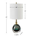 The Enigma Buffet Lamp Showcases A Smoky Teal Blue Art Glass Body Paired With Brass Plated Details And A Clear French Cord. The Tall Drum Hardback Shade Is Covered In A Crisp White Linen Fabric.