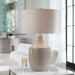 This Ceramic Base Keeps It Simple In Shape, Yet Upscale With Its Fashionable Pattern That's Finished In A Distressed Blue-gray Glaze, Paired With Brushed Nickel Plated Accents. A Linen Fabric, Hardback Drum Shade Completes This Table Lamp.