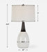 This Unique Table Lamp Seamlessly Blends Elegance And Uniqueness Into One Captivating Design. The Crackled White Ceramic Base Flows Gracefully Into A Black Iron Fluted Neck, Creating A Striking And Seamless Transition. The Lamp Is Topped With A Slightly Tapered Round Hardback Shade In A Crisp White Linen Fabric.