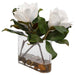 A Trio Of White Magnolia Blooms Are Placed In A Clear Glass Vase With Faux Water And Natural River Stones.