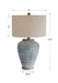 This Table Lamp Design Features A Ceramic Base With A Global, Bohemian Flair, Finished In A Light Aqua Blue Crackle Glaze With A Light Gray Textured Pattern. The Foot And Neck Have A Porous Texture, Finished In A Warm Concrete Look. A Hardback Drum Shade In Beige Linen Fabric With Natural Slubbing Completes This Piece.