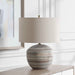 This Ceramic Accent Lamp Features A Striped Motif In Neutral Shades Of Brown, Taupe, Cream And Blue Accented By Light Brushed Brass Plated Details. A Light Beige Linen Drum Shade With Natural Slubbing Completes The Piece.