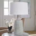 Drawing Inspiration From Antique Clay Pottery, This Table Lamp Is Handcrafted From Ceramic In A Mottled Gray And Off-white Matte Glaze With Subtle Carved Details. Steel Accents Are Finished In Brushed Nickel. The Hardback Drum Shade Is Covered In A Casual White Fabric.