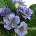 A Trio Of Charming Primulas Featuring Broadleaf Foliage With Delicate Blooms In Periwinkle, White And Fuchsia, Potted In Dimpled, White Glazed Ceramic Containers.