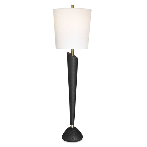 UttermostThis Futuristic Buffet Lamp Design Is Made Of Cast Black Man-made Stone With A Noticeable Pitted Surface, Paired With Antique Brass Plated Details....