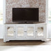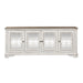 This European traditional styled 84" tv stand is sure to be the focal point of any living room. Crafted with poplar solids and white oak and birch veneers, this piece can accommodate most 92" TVs and features an antique white finish, adjustable shelf space, antique pewter knob hardware, canted corners, bracket feet, and antiqued mirror doors with decorative grid overlay. With today's modern technology in mind, users can enjoy the convenience of the wire management provisions to hide those pesky wires from your DVD player or gaming console of choice. Create your own look and change out two or all four doors to display either the wood framed panel doors or the option of antique mirror with decorative overlays. These versatile options allow you to be creative with your furniture.