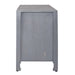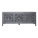Marisol 65” accent TV console gives you that Boho chic feel that is so popular today. Boho is a mix of colors, styles, and materials to create a carefree causal comfortable space. Crafted of solid mango with a soft wash grey finish. Features three artisan hand craved doors in a floral pattern, one fixed shelf behind each door, shaped block legs with antique brass knob hardware. Perfect as a TV console.