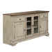 Combine traditional living and todays modern lifestyle effortlessly with the Morgan Creek 68" tv stand. Crafted with polar solids with pine and birch veneers, this piece can accommodate most 76" TVs and features an antiqued white base with brushed tobacco tops and heavy distressing, wood framed glass doors that allow for remotes to work through the glass, removeable side molding that allow this piece to stand alone, adjustable shelving, and is anchored by bracket feet. Wire management provisions effortlessly accommodates a DVD player or gaming console of choice. The warm antique finishes and artistic distressing along with grand scale, makes this a piece to be passed on to generations.