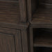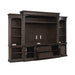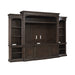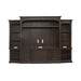 Make your home impressive with the Paradise Valley entertainment center with piers. Crafted with Rubberwood solids and Split Heart White Oak veneers, this set features a Saddle Brown finish. The console showcases breakfront styling and has two full extension drawers and two doors with wood framed drawer and door fronts that are accented with bead molding and Antique Pewter drop bail and knob hardware. One adjustable shelf is located behind each door. The piers have a unique concave shaped front with heavy crown molding and adjustable shelves. The top two shelves feature a glass insert, allowing the touch LED lighting to shine through to your display. The hutch features an adjustable and removable shelf, a planked back panel, and touch LED lighting. Chamfered pilasters soften this entertainment wall unit, and flow into a heavy plinth base. Paradise Valley captures grand opulence with comfortable rustic styling.