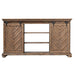 A craftsman built media piece finished in antique honey over mango veneer, featuring chevron patterned sliding doors with carved molding details and a classic bun foot. Aged black iron sliding hardware allows for concealing or revealing multiple storage options. Each side has two adjustable shelves, with two fixed shelves in the center.